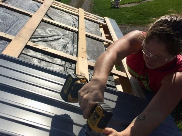In this class we will practice the installation of two different types of roofing.  Our tiny house and shed will be roofed with agricultural style, corrugated, metal, and we will install asphalt shingles on a practice roof.