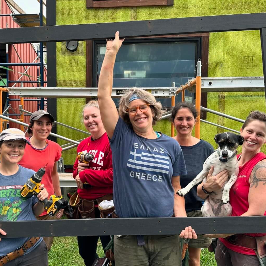 Maria, center holding up exterior trim built in class surrounded by students, Hammerstone staff and Junie!