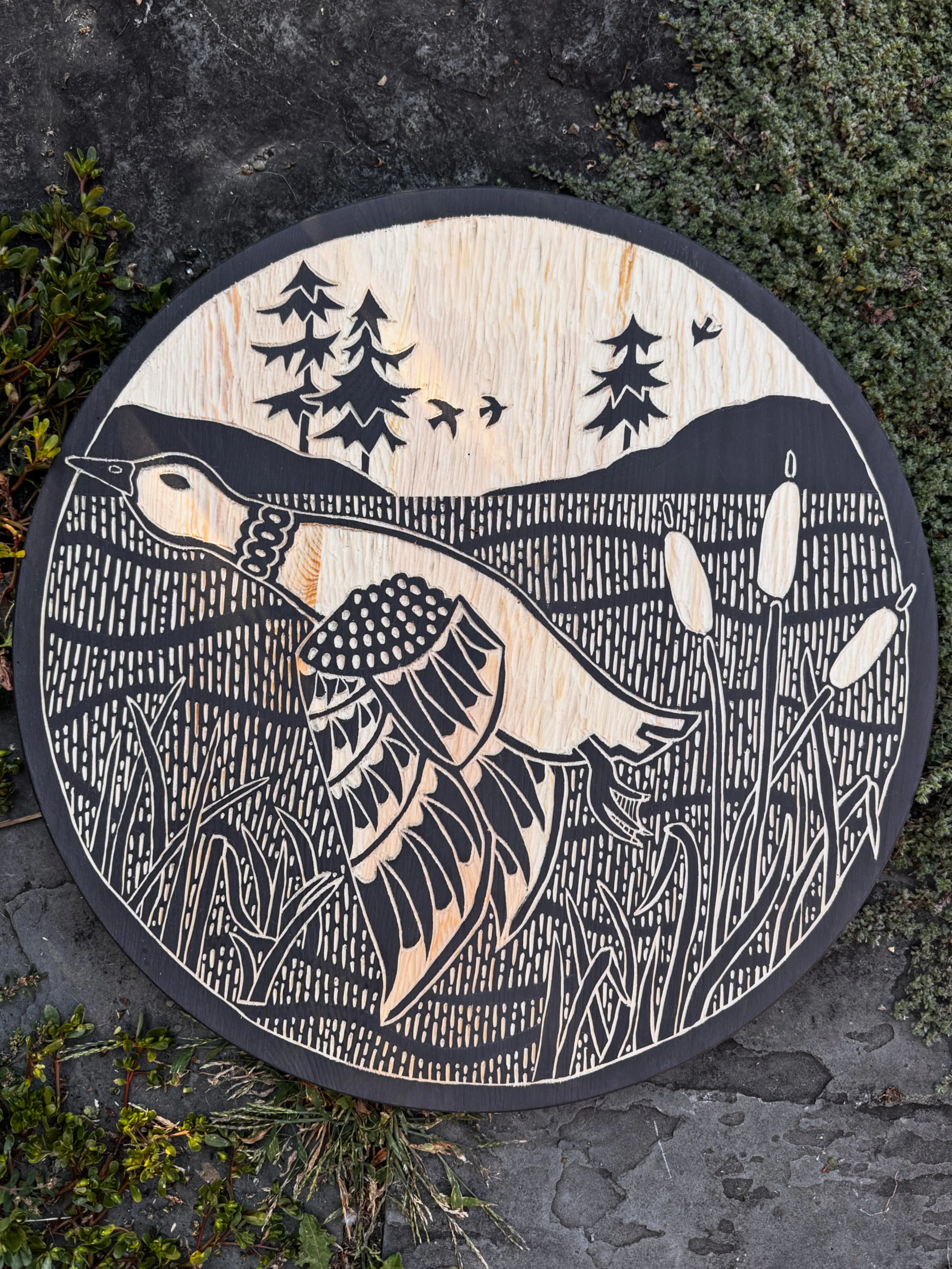 A much more recent carving on pine. This carving was inspired by the visit from snow geese Cayuga lake experienced last year.